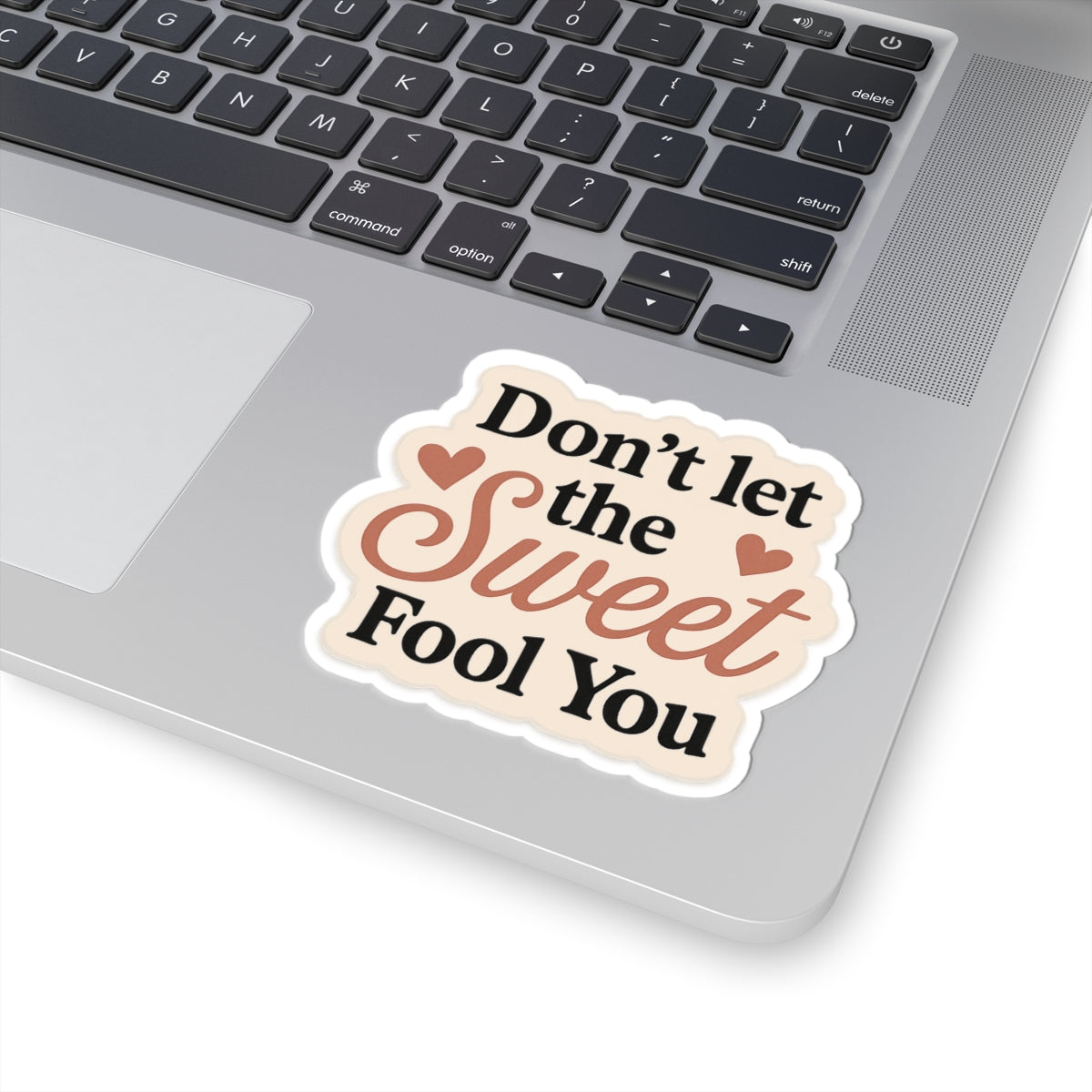 A glossy kiss-cut sticker that blends playful charm with quiet sass. Creamy beige background, soft terracotta script, and bold black type combine to form the phrase “Don’t let the Sweet Fool You,” framed with tiny heart accents. It sticks cleanly to laptops, journals, water bottles, and other smooth, flat surfaces to add personality and a wink of attitude to everyday gear. The finish gives a bright, slightly reflective look that keeps colors popping while resisting light scratches. Easy to apply without bubbles and available in transparent or white-backed options to suit your style.
